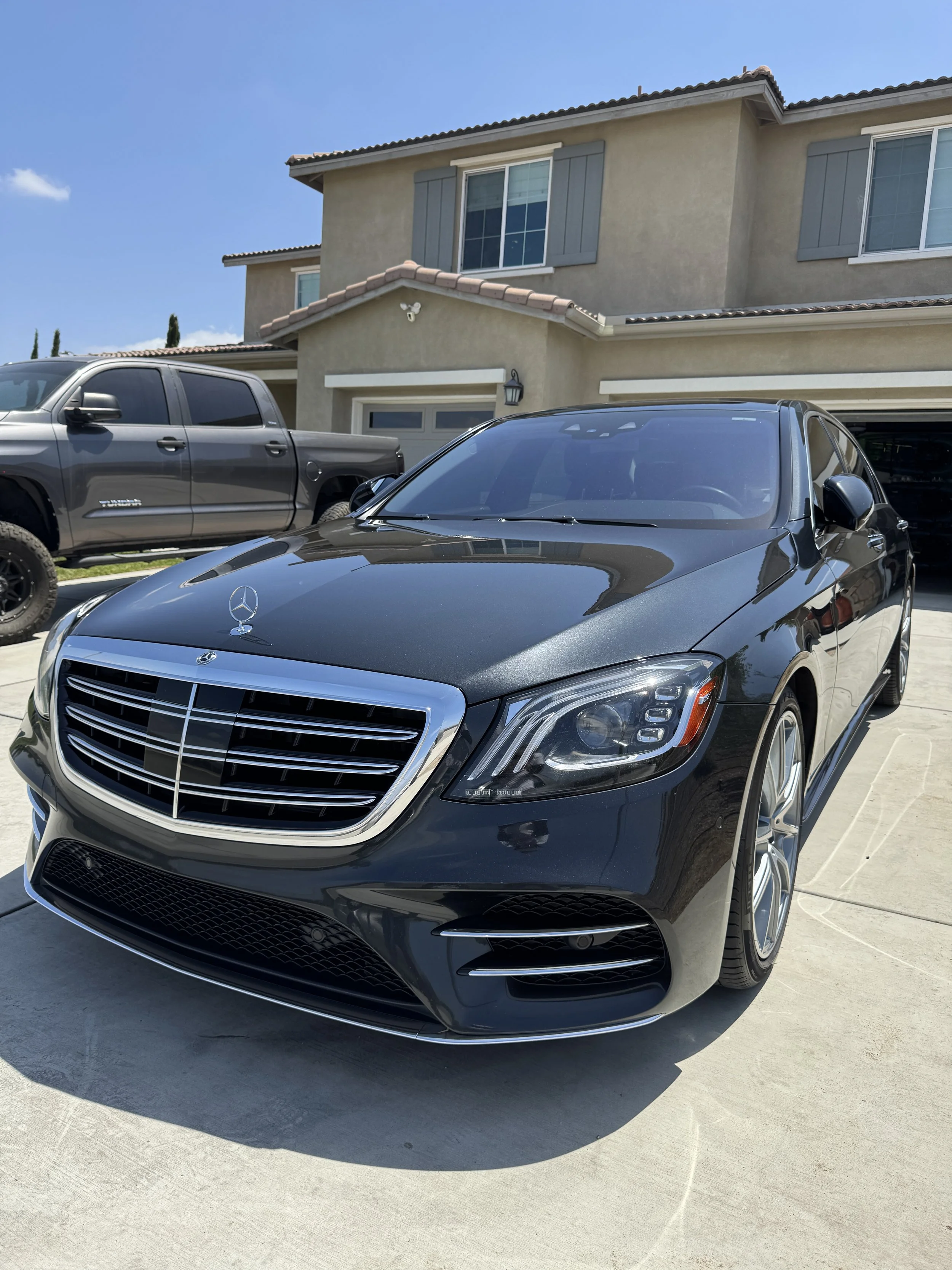 A black Mercedes-Benz sedan parked in the driveway of a suburban house.