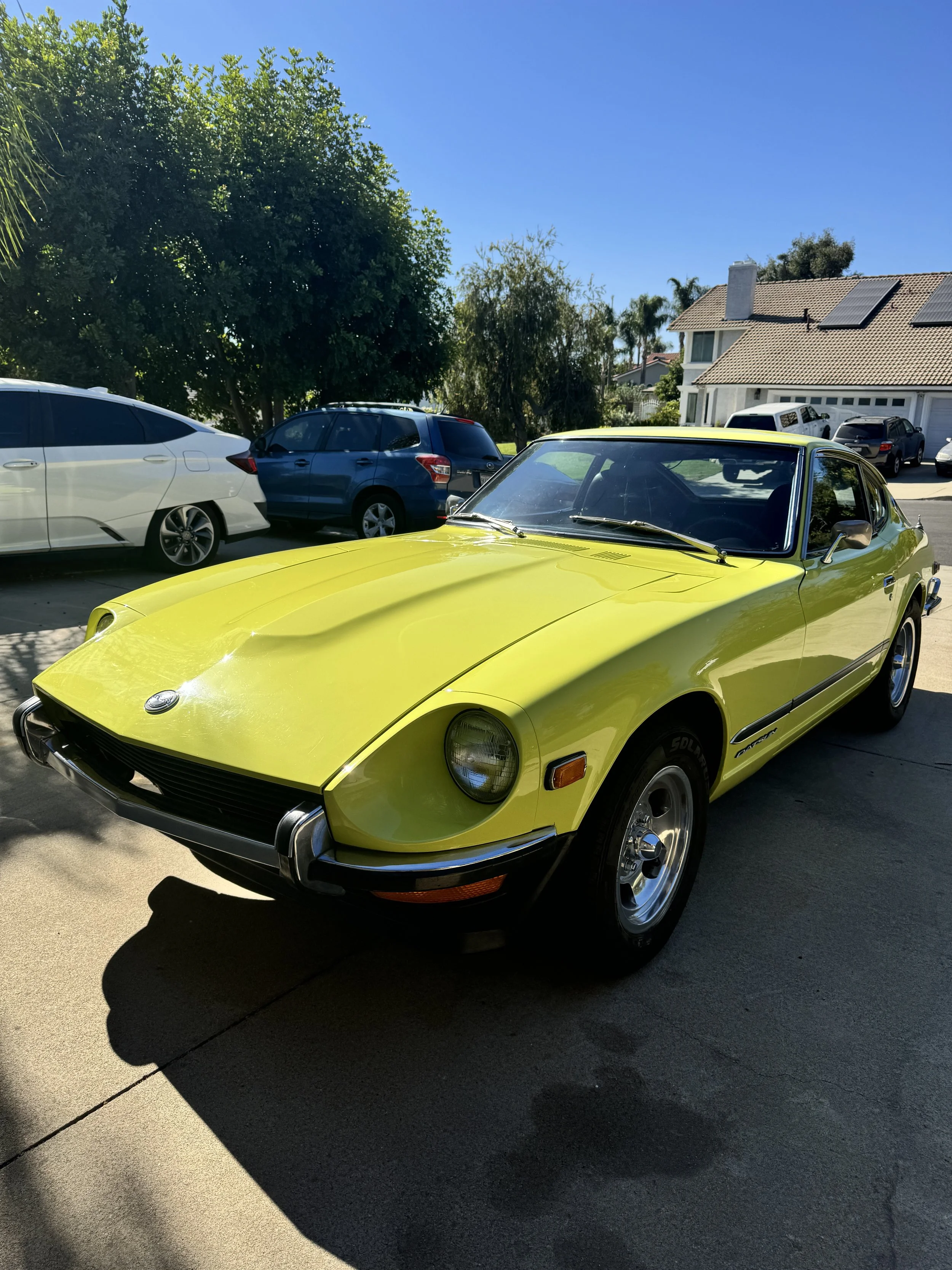 Nissan 240Z parked on a driveway with other cars in the background, trees, and a house